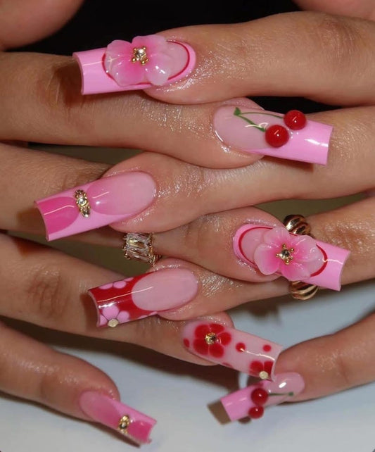Kawaii 3D Cherry & Floral Press On Nails - Long Square
