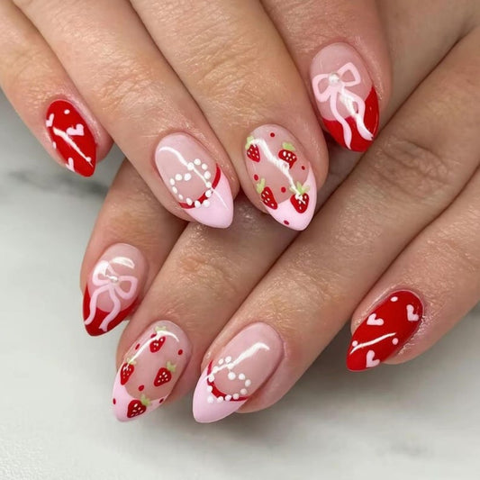 Strawberry Coquette Bow Press On Nails - Pink & Red Almond
