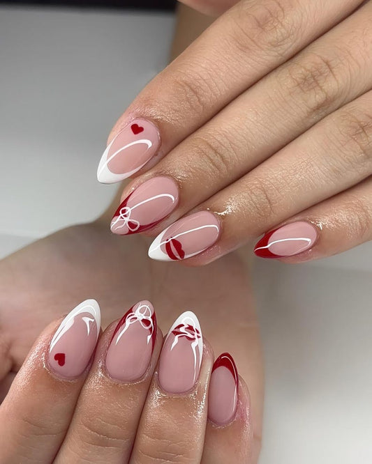 Romantic Coquette French Press On Nails - Red & White Almond