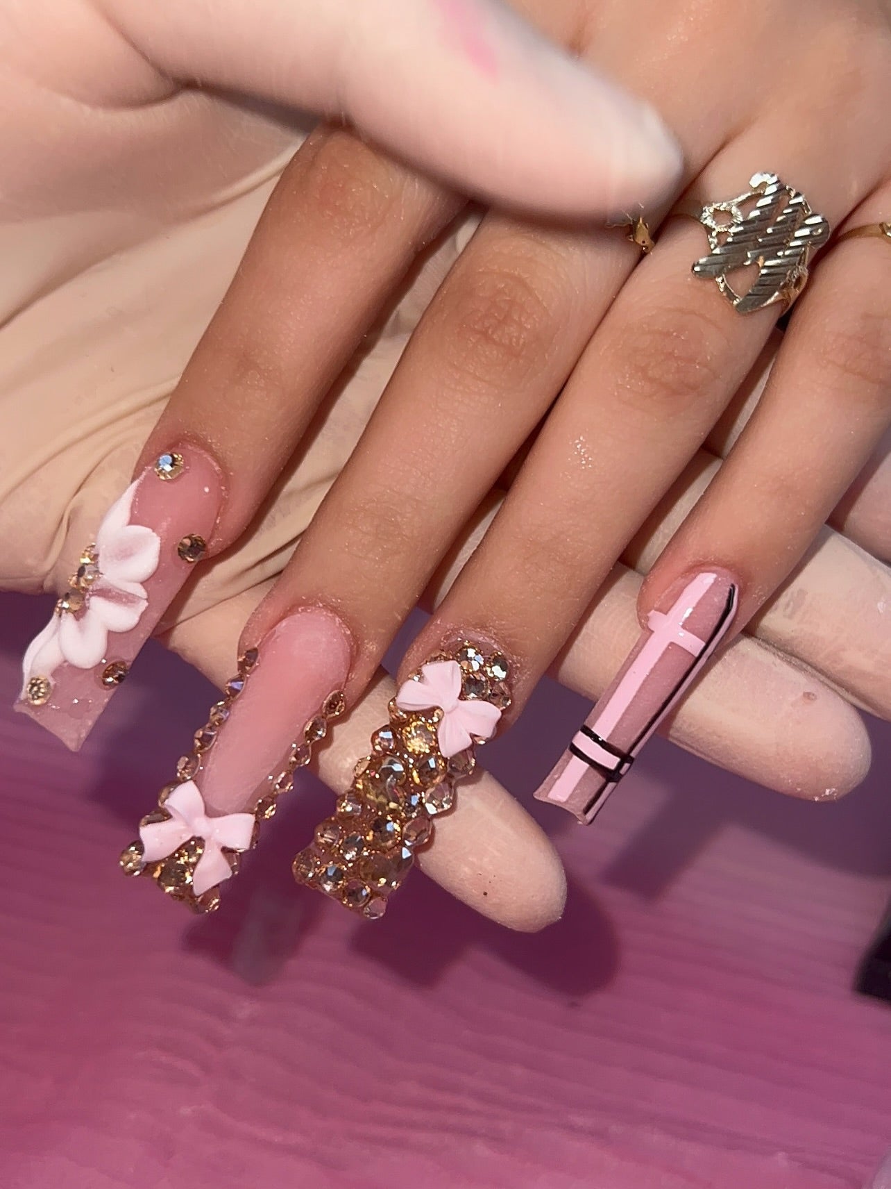 Meta Description: Shop our Gilded Floral & Pink Ribbon Press On Nails. Features hand-sculpted 3D flowers, gold rhinestones, and plaid art. Reusable long square luxury nails.