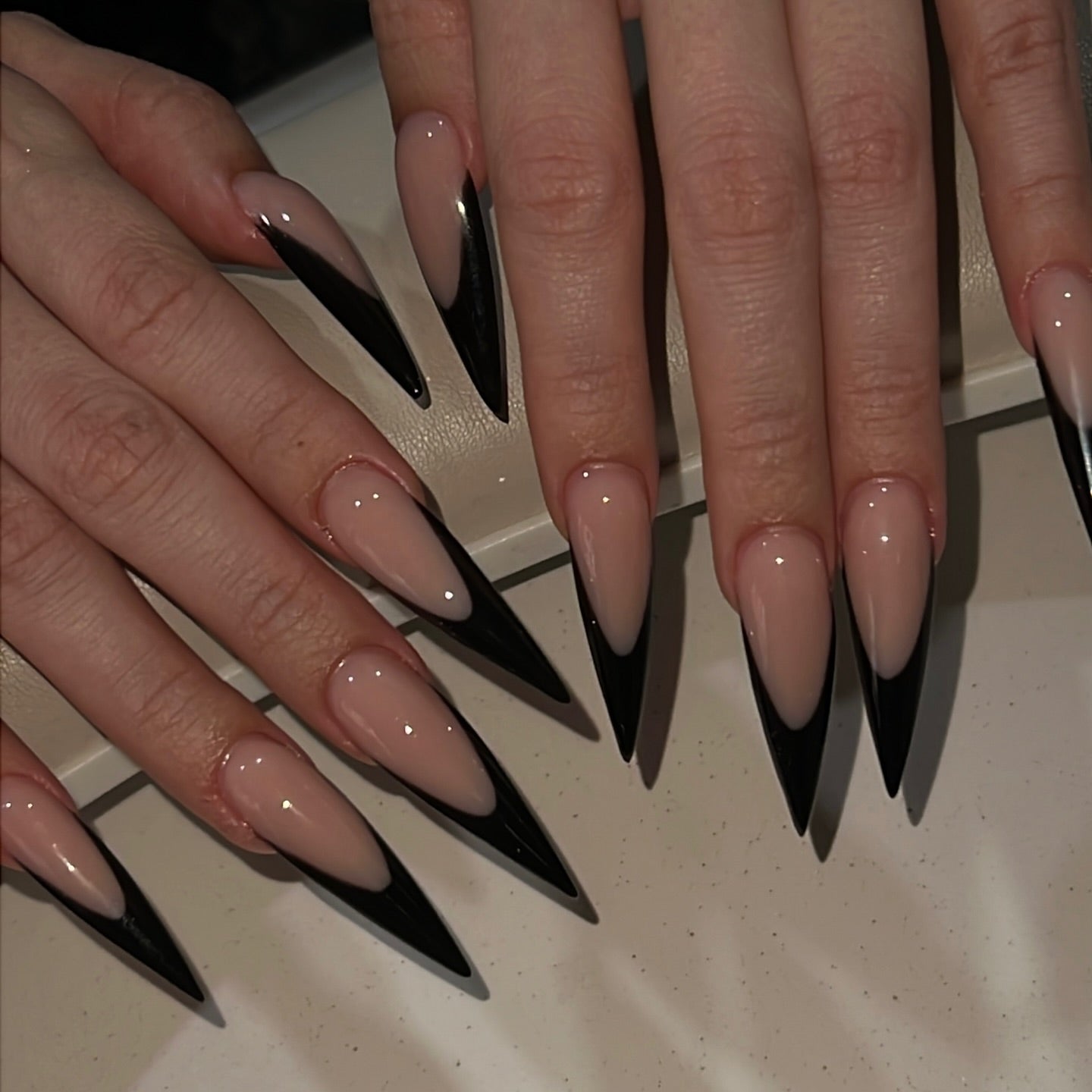 Make a powerful statement with our "Midnight Noir" luxury press-on set. This design takes the timeless French manicure and gives it a high-fashion edge, featuring a deep onyx V-cut tip that creates a sharp, dramatic profile. Set against a perfectly translucent nude base and finished with a mirror-like high-gloss topcoat, these XL stiletto nails are engineered for the modern trendsetter.