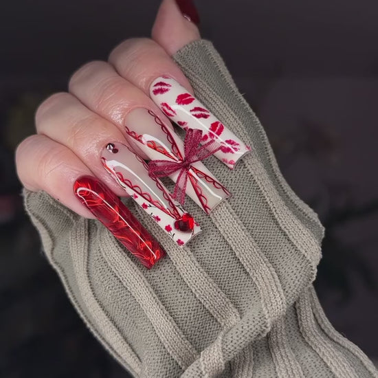Capture hearts with our most romantic and intricate set yet. Featuring a stunning mix of hand-painted "kiss" art, textured 3D corset lacing, and a bold molten red chrome finish, these nails are the ultimate accessory for Valentine’s Day or any night you want to feel unforgettable.